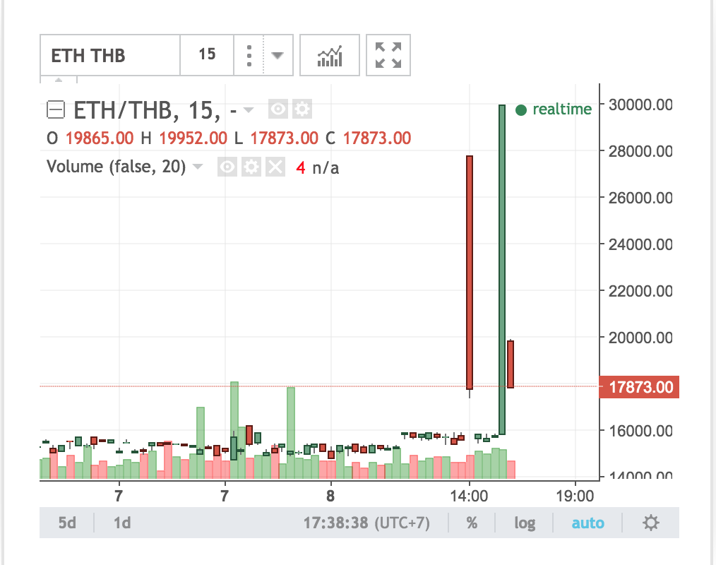 ในขณะเดียวกัน ตลาดแลกเปลี่ยนเหรียญคริปโตในประเทศไทยอย่าง Bx นั้นก็ได้มีการพุ่งขึ้นของราคาเหรียญ Ether เช่นกัน โดยในขณะที่กำลังรายงานข่าวอยู่นี้ ราคาของมันอยู่ที่ 17,204 บาท โดยไปแตะจุดสูงสุดที่ 17,796.87 บาท และมีโวลลุ่มการซื้อขายอยู่ที่ 4766.13 ETH