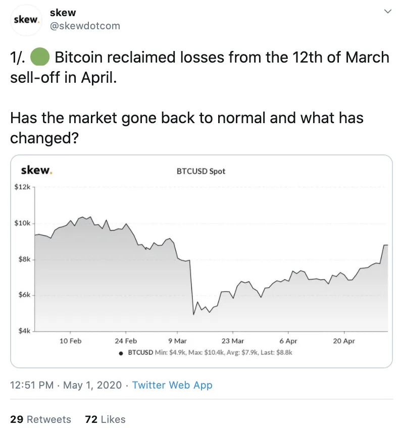 ผู้ใช้งานทวิตเตอร์รายหนึ่งนามว่า skew (@skew) ได้ออกมาชี้ว่าตลาด Bitcoin นั้นดูเหมือนว่าจะกลับมา ‘ปกติ’ อีกครั้งหนึ่งแล้ว