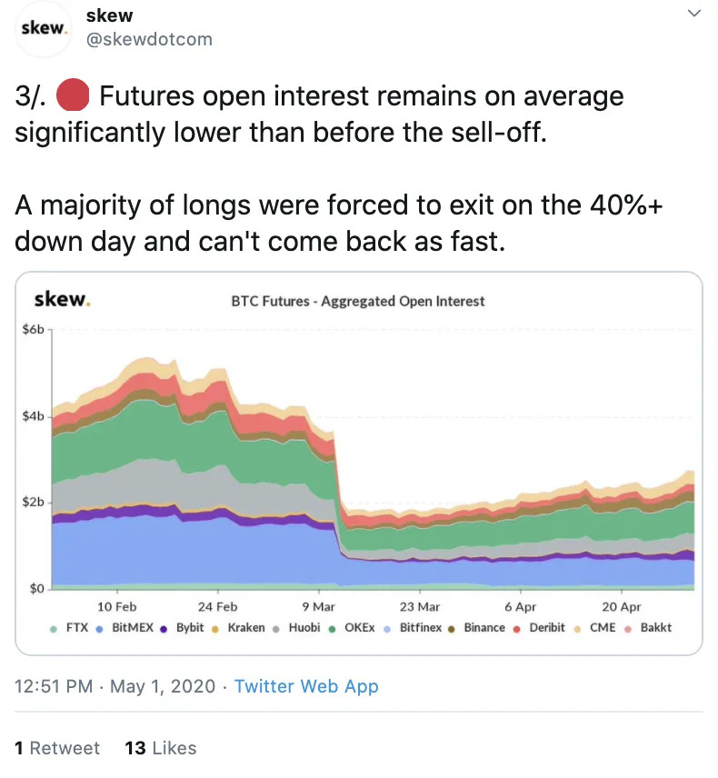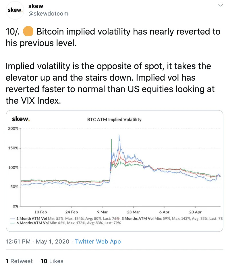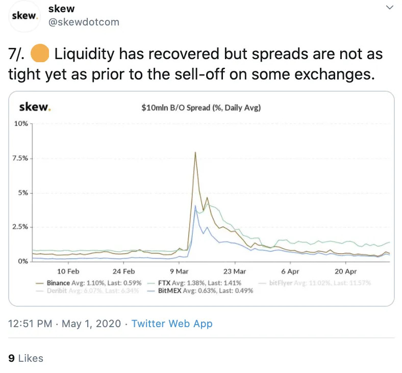 นอกจากนี้สภาพคล่องของ Bitcoin นั้นก็ได้มีการเริ่มกลับมาแล้วด้วย หลังจากความผันผวนอย่างรุนแรงเมื่อเดือนมีนาคมที่ผ่านมา ตามรายงานของ be in cryptoก่อนหน้านี้ นอกจากนี้ทาง skew ก็ยังได้ออกมาชี้ว่าความผันผวนของตลาด Bitcoin นั้นได้กลับมาปกติแล้ว