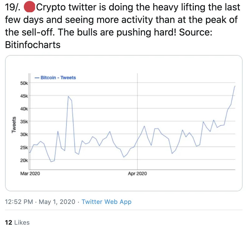 นอกจากนี้จำนวนของการพูดถึงความว่า ‘Bitcoin’ บน Twitter นั้นยังเพิ่มสูงขึ้นตั้งแต่ช่วงกลางเดือนเมษายนที่ผ่านมาอีกด้วยเช่นกัน