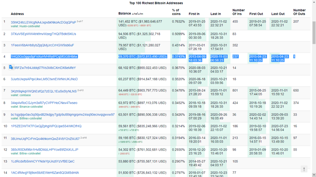 กระเป๋าดังกล่าวนั้นถูกโอน Bitcoin ออกไปเมื่อวันที่ 3 พฤศจิกายน 2020 โดย Bitcoin จำนวน 69,369 BTC ได้ถูกโอนออกจาก address อย่าง 1HQ3Go3ggs8pFnXuHVHRytPCq5fGG8Hbhx ไปยัง bc1qa5wkgaew2dkv56kfvj49j0av5nml45x9ek9hz6 และจ่ายค่าธรรมเนียมเพียงแค่ 0.00087980 BTC เท่านั้น โดยเหรียญ Bitcoin ทั้งหมดนั้นคิดเป็นมูลค่ารวม ๆ เกือบ 1 พันล้านดอลลาร์ หรือ 3 หมื่นล้านบาทเลยทีเดียว