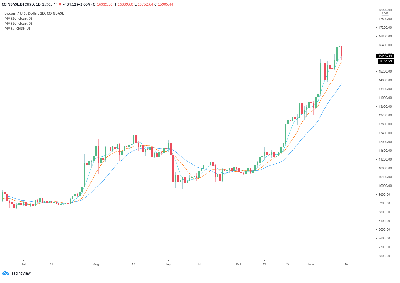 ในวันที่ 14 พฤศจิกายนนี้ เส้น MA 20 วันของ Bitcoin บนกราฟ 1 วันนั้นอยู่ที่ 14,600 ดอลลาร์ในระยะสั้น โดยหากเกิดการปรับฐานของราสคาเกิดขึ้น ระดับราคาที่ 14,600 ดอลลาร์นั้นก็ยังคงเป็นระดับที่ผู้ซื้อมองว่าน่าสนใจอยู่ไม่น้อย