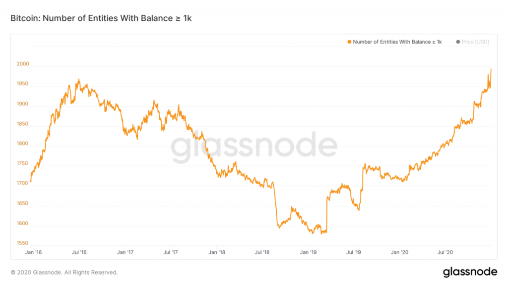 จำนวนตัวเลขของกระเป๋าเก็บเหรียญ Bitcoin (BTC) ที่มีจำนวนมากกว่า 1,000 BTC นั้นได้เพิ่มขึ้นทำจุดสูงสุดใหม่แล้วที่ 1,994 กระเป๋าในวันนี้ โดยตัวเลขเก่านั้นอยู่ที่ 1,969 กระเป๋าเมื่อปี 2016 ที่ผ่านมา อ้างอิงจาก Glassnode