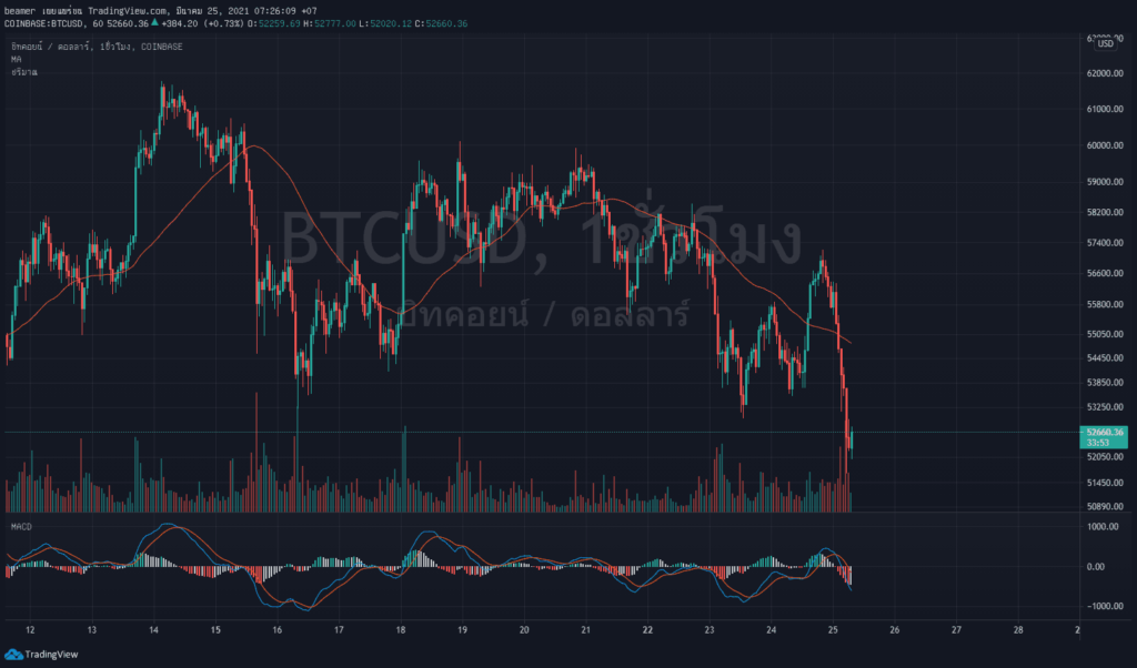 อย่างไรก็ตาม เมื่อวานนี้เราได้เห็นการดีดขึ้นของราคา Bitcoin อย่างรุนแรงหลังจากทีนาย Elon Musk ออกมาเผยว่าทาง Tesla นั้นได้เปิดให้ใช้ Bitcoin เป็นช่องทางในการซื้อรถไฟฟ้าของพวกเขาทางเว็บไซต์แล้ว โดยพุ่งทะลุ 57,000 ดอลลาร์ ก่อนที่จะร่วงลงมาในช่วงข้ามคืน