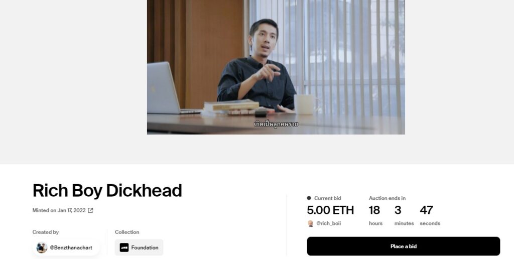 ดูเหมือนว่าในปัจจุบันประเทศไทยจะเริ่มให้ความสำคัญกับแวดวง NFT เพิ่มขึ้นอย่างต่อเนื่อง โดยล่าสุดนั้นนาย ธนชาติ ศิริภัทราชัย ผู้สร้างโปรเจกต์ The Good Human ได้นำมีมของหนุ่มแวน ธิติพงษ์ ที่กำลังเป็นกระแสไวรัลบนโลกออนไลน์จากคลิปล้อเลียน’สัมภาษณ์คนรวย’ มาเปิดประมูลในรูปแบบ NFT ด้วยเช่นเดียวกัน