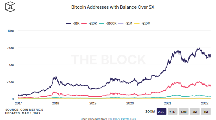 จำนวนกระเป๋าเงิน Bitcoin ที่ถือเหรียญมากกว่า 1,000 BTC หรือคิดเป็นมูลค่าประมาณ 43 ล้านดอลลาร์ ได้เห็นตัวเลขที่เพิ่มขึ้นอย่างรวดเร็วในวันจันทร์ ซึ่งเกิดขึ้นไม่นานหลังจากกลุ่มประเทศโลกตะวันตกอย่างสหรัฐอเมริกา สหภาพยุโรป (EU) ได้เพิ่มมาตรการคว่ำบาตรต่อรัฐบาลรัสเซีย