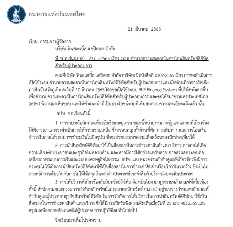 พร้อมกันนี้เมื่อวันที่ 21 มี.ค.ทางธนาคารแห่งประเทศไทยยังได้ออกมาชี้แจงในเรื่อง การขอดำเนินการเปิดใช้ระบบอำนวยความสะดวกในการโอนสินทรัพย์ดิจิทัลสำหรับผู้ประกอบการและนักท่องเที่ยวชาวรัสเซียภายในจังหวัดภูเก็ตเพื่อขอเปิดใช้ระบบ BKF Finance System ที่บริษัท FINSTABLE พัฒนาขึ้นอีกด้วย โดยทางธนาคารแห่งประเทศไทยพิจารณาว่า