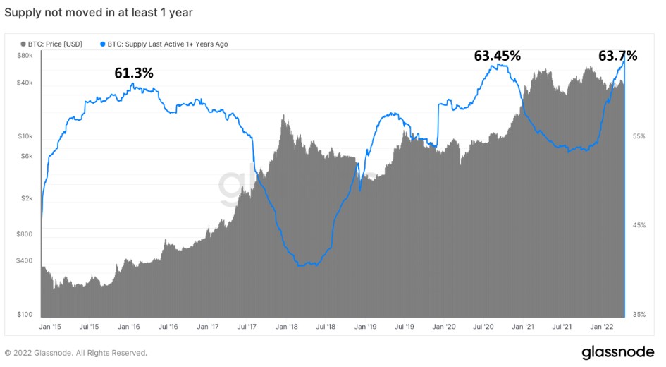 “การวัดพฤติกรรมการถือครองอีกวิธีหนึ่งคือ การดูปริมาณการใช้งานอยู่ครั้งสุดท้ายเมื่อปีที่แล้ว เป็นการวัดที่เรียบง่าย แต่ทรงพลัง ณ สัปดาห์นี้พุ่งสูงสุดตลอดกาล คือ 63.7% ของอุปทานของ Bitcoin ที่ไม่ได้เคลื่อนย้ายมาน้อยหนึ่งปี “