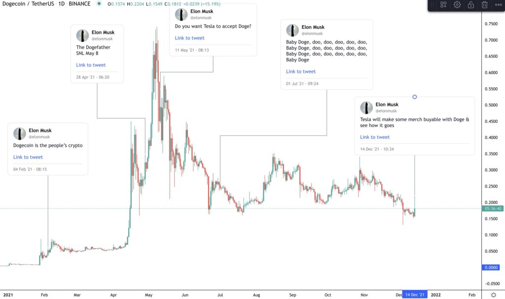 จากรูปจะเห็นเลยว่าการโพสต์ทวีตของ Elon Musk แต่ละครั้งจะสามารถทำให้ราคา Bitcoin ขยับได้แต่แท้จริงแล้ว ไม่ว่าเขาจะพูดอะไรกราฟก็ขยับทุกเหรียญ