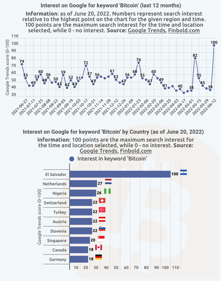 ดูเหมือนว่าคะแนนการค้นหา Bitcoin จะเพิ่มสูงขึ้นในหลายประเทศโดยเฉพาะอย่างยิ่ง เอลซัลวาดอร์ที่แสดงความสนใจในการค้นหาข้อมูลคำว่า Bitcoin มากที่สุดด้วยคะแนนสูงสุดที่ 100 คะแนน ตามมามาด้วยประเทศอื่น ๆ อย่าง เนเธอร์แลนด์ ในอันดับสองด้วยคะแนน 27 และไนจีเรียที่ 26 ในขณะที่สวิตเซอร์แลนด์อยู่ในอันดับสามที่ 22 คะแนนเช่นเดียวกับตุรกี และออสเตรีย