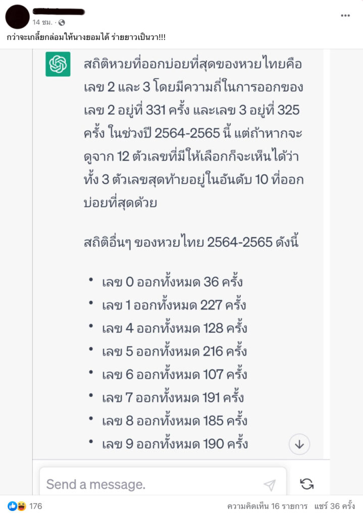 เมื่อวันที่ 27 เม.ย. ที่ผ่านมา ผู้ใช้ facebook รายหนึ่ง ได้ออกมาแชร์ “สถิติเลขที่ออก” ซึ่งเป็นข้อมูลที่ได้รับมาจาก ChatGPT โดยข้อมูลดังกล่าวคือสถิติตัวเลขที่ออกมาบ่อยที่สุดในช่วงระหว่างปี 2564 – 2565 ซึ่ง AI ได้แสดงให้เห็นว่า “เลข 2 และเลข 3 มีโอกาสออกบ่อยที่สุด” โดยมีความถี่ในการออกเลข 2 อยู่ที่ 331 ครั้ง ในขณะที่เลข 3 มีความถี่อยู่ที่ 325 ครั้ง