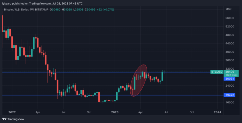ข้อมูลจาก TradingView แสดงให้เห็นว่าราคาของ Bitcoin ปิดแท่งเดือนมิถุนายนที่ราคา 30,469 ดอลลาร์ ซึ่งคิดเป็นกำไรมากกว่า 83% นับตั้งแต่ต้นปี โดยปัจจุบัน Bitcoin มีมูลค่าซื้อขายที่ 30,503 ดอลลาร์