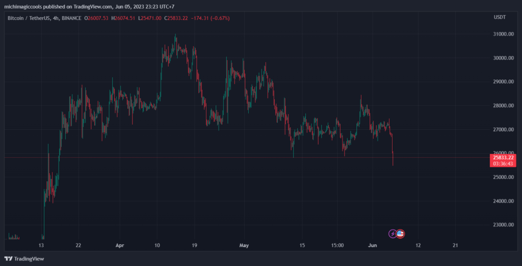 ราคา Bitcoin ร่วงลงอย่างรุนแรงแตะระดับราคา 25,470 ดอลลาร์โดยทำราคาร่วงลงมากกว่า 5% ใน 24 ชั่วโมงหลังจากที่ Binance และ CZ ถูก ก.ล.ต. สหรัฐฯ ฟ้องร้องข้อหาละเมิดกฎหมายหลักทรัพย์สหรัฐฯ