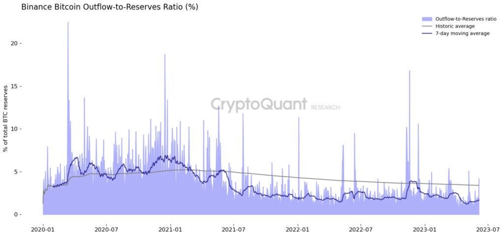 ด้าน Julio Moreno หัวหน้าฝ่ายวิจัยของ CryptoQuant ยังตั้งข้อสังเกตด้วยว่า Bitcoin Outflows-to-Reserves Ratio ของ Binance ยังคงอยู่ในระดับต่ำ