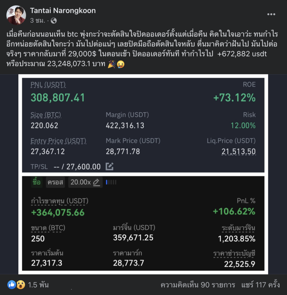 แทนไท โพสต์ลงบน Facebook ส่วนตัวของตนโดยได้สื่อถึงความใจเย็นของเขา ที่ไม่ยอมปิดก่อนที่ราคาจะพุ่งทะลุราคา 29,000 ดอลลาร์ ทำให้เขาสามารถทำกำไรได้เป็นกอบเป็นกำ