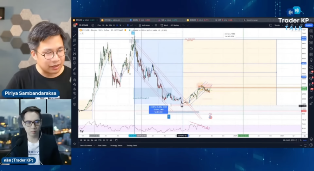 นอกจากนี้อาจารย์ตั๊มยังพูดถึงกราฟวัฏจักร 4 ปีของ Bitcoin ซึ่งเป็นการอ้างอิงเหตุการณ์ Halving รวมถึงการปรับตัวขึ้นของราคาที่เกิดจากกระแสต่าง ๆ ซึ่งแสดงให้เห็นว่า ในขณะนี้ Bitcoin กำลังอยู่ในช่วงขาขึ้น (โซนสีเหลือง) โดยราคาจะวิ่งอยู่ที่ช่วงระหว่าง 15,000 ดอลลาร์ถึง 69,000 ดอลลาร์