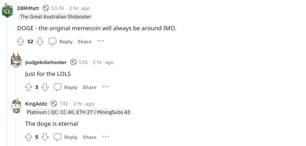 มากันที่คอมเม้นต์แรก ที่บอกว่าเหรียญที่ไม่มีวันตายนั้นก็คือ เหรียญมีม No.1 อย่าง Dogecoin เรียกได้ว่า Dogecoin นั้นเป็นเหรียญมีมที่เป็นกระแสมาอย่างยาวนาน และอยู่ในยุคเดียวกันกับ Bitcoin