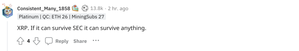 ชาวเน็ตรายหนึ่งบน Reddit ก็เริ่มสงสัยในประเด็นนี้เช่นกันว่ าจะมีเหรียญไหนบ้างที่จะคงอยู่ไปตลอด ไม่สูญมูลค่าไป และจากที่เหตุการณ์ต่าง ๆ ที่ผ่านมามี altcoins มากมายในตลาดที่บางตัวรอดและไม่รอดจากวิกฤตตลาดหมี