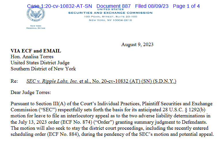 สำนักงานคณะกรรมการกำกับหลักทรัพย์และตลาดหลักทรัพย์ (SEC) ของสหรัฐอเมริกากำลังยื่นอุทธรณ์คำตัดสินของศาลในเดือนกรกฎาคมจากการฟ้องร้องในคดี Ripple Labs ที่ตัดสินว่าการขาย XRP นั้นไม่ใช่หลักทรัพย์ หากขายให้กับนักลงทุนรายย่อย