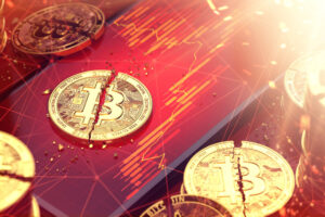 Broken,Bitcoin,Split,In,Two,Pieces,Laying,On,A,Red