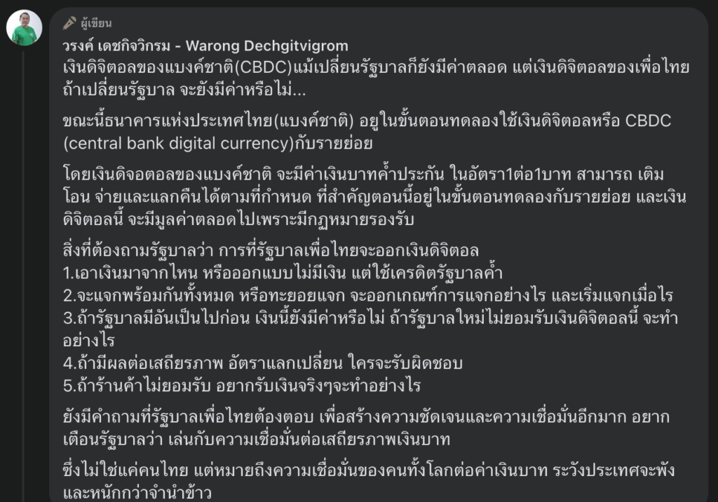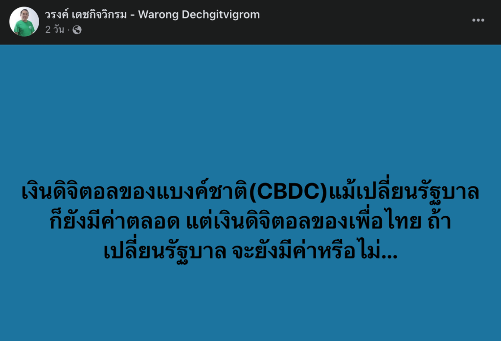 “เงินดิจิตอลของแบงค์ชาติ(CBDC) แม้เปลี่ยนรัฐบาลก็ยังมีค่าตลอด แต่เงินดิจิตอลของเพื่อไทย ถ้าเปลี่ยนรัฐบาล จะยังมีค่าอยู่หรือไม่…”