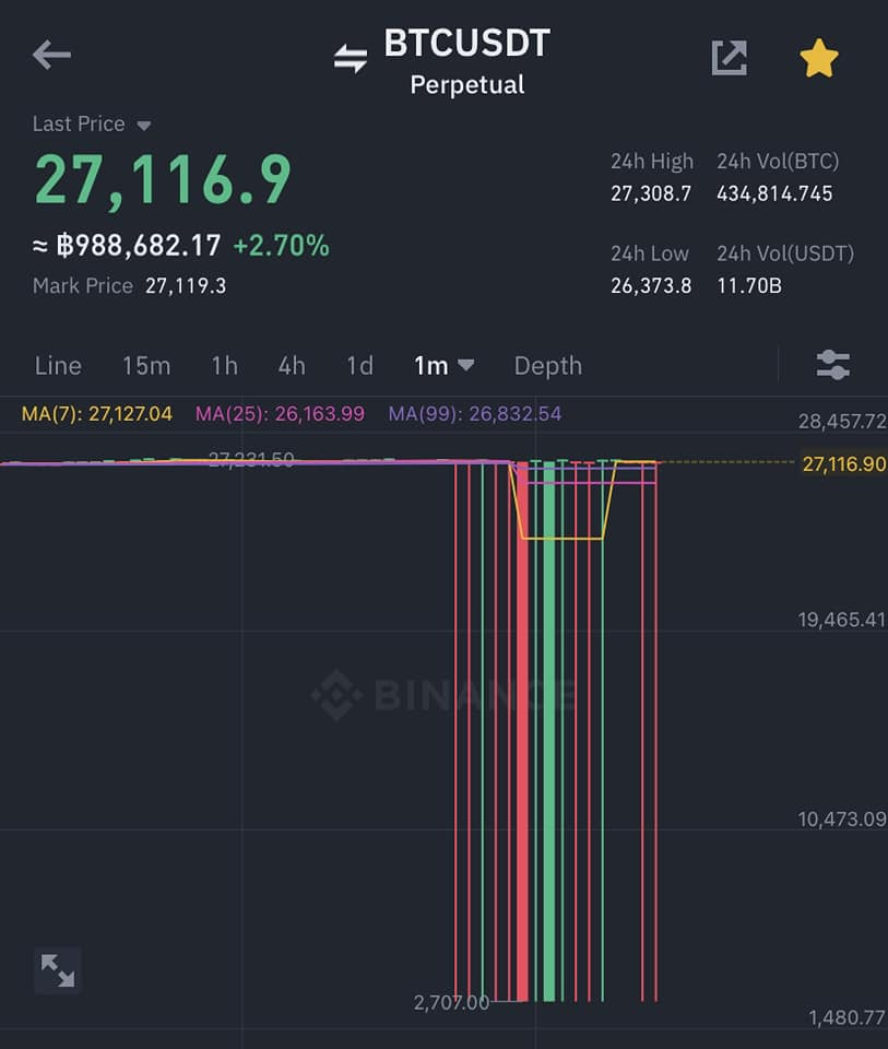 กระดานเทรดยักษ์ใหญ่อย่าง Binance ดูเหมือนจะมีข้อผิดพลาดเกิดขึ้นในระบบอีกครั้งเมื่อจู่ ๆ กราฟราคา Bitcoin บนกระดาน Future ก็เริ่มผิดปกติ ลากขึ้นลากลง ผันผวนอย่างฉับพลัน