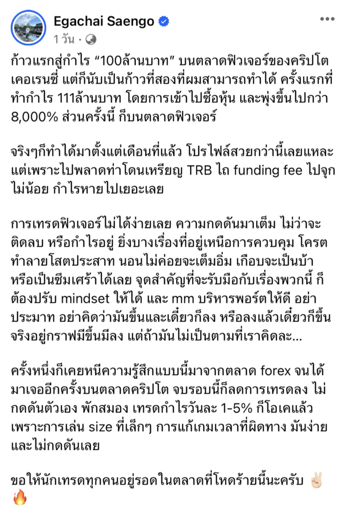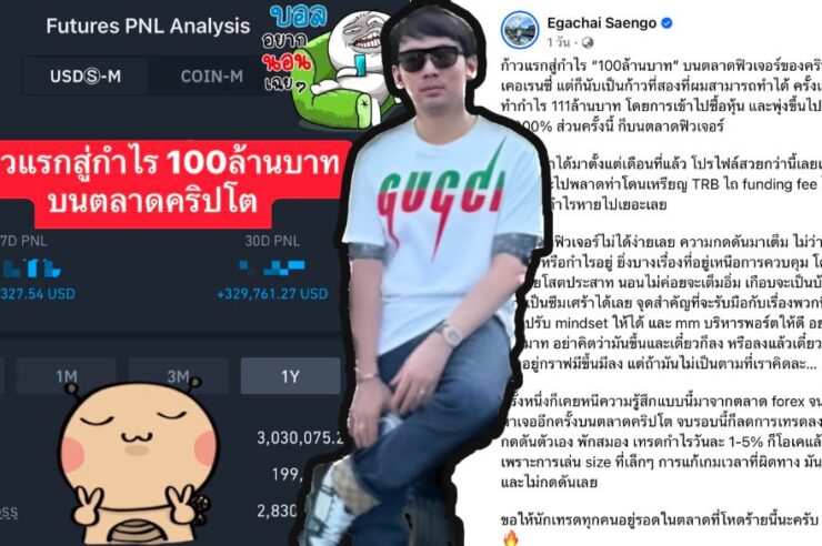 เริ่มเรื่องมา คุณ Egachai Saengo ได้โพสต์แชร์ประสบการณ์ ก้าวแรกสู่กำไร “100 ล้านบาท” บนตลาดคริปโตฟิวเจอร์ อย่างไรก็ตามเขากล่าวเสริมว่านี่นับเป็นก้าวที่สองแล้วที่เขาสามารถทำได้ เพราะครั้งแรกเขาเคยทำกำไรได้ถึง 111ล้านบาท โดยเข้าไปซื้อหุ้น และราคาพุ่งขึ้นไปกว่า 8,000% ส่วนครั้งนี้ก็บนตลาดฟิวเจอร์