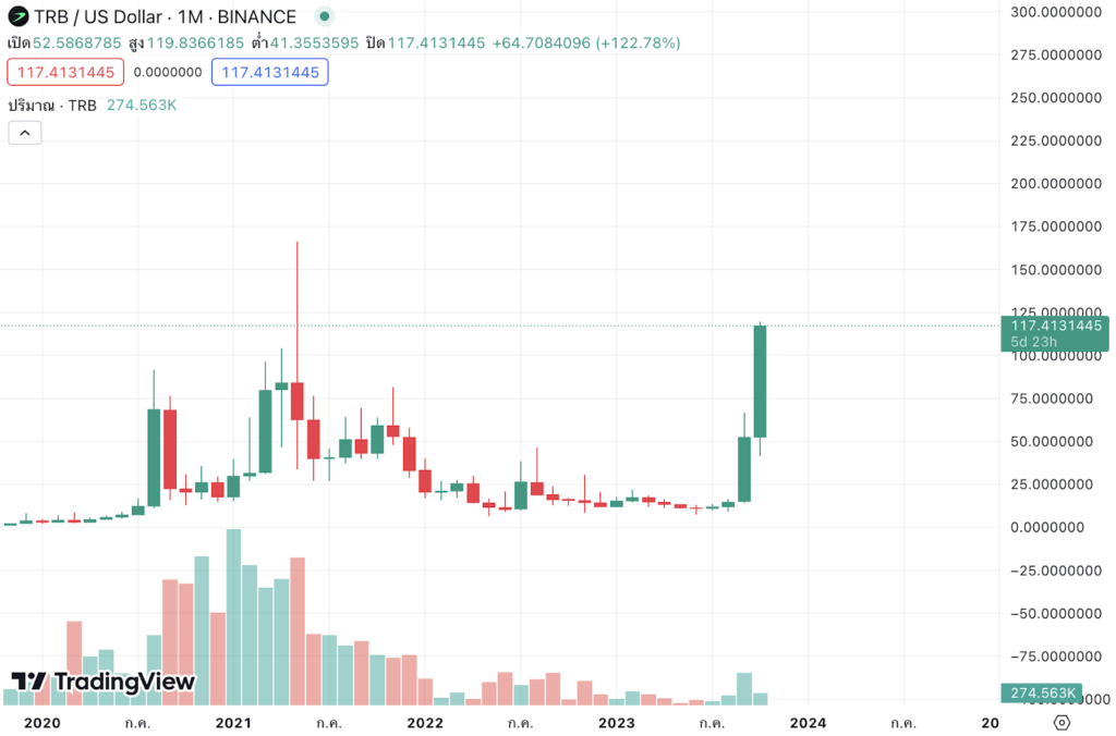 ในช่วงสองเดือนที่ผ่านมานี้ ดูเหมือนเหรียญ Tellor (TRB) จะดึงดูดความสนใจของนักลงทุนเป็นพิเศษ โดยราคาได้เพิ่มขึ้นอย่างรุนแรงจาก 10 ดอลลาร์ ในวันที่ 25 สิงหาคม จนอยู่ที่ระดับ 110 ดอลลาร์ ณ วันที่ 25 ตุลาคม หรือเรียกได้ว่าราคา TRB เพิ่มขึ้นกว่า 1,100% และยังคงเพิ่มขึ้นอย่างต่อเนื่องโดยได้รับอิทธิพลจากแรงซื้อของเจ้ามือ