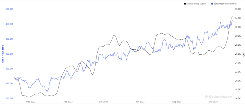 จากกราฟจะเห็นได้ว่า Hashrate ในการขุด Bitcoin ได้เพิ่มขึ้นเมื่อเร็ว ๆ นี้ และเพิ่งทำจุด All-Time High โดยค่าล่าสุดที่วัดได้คือประมาณ 464 EH/s