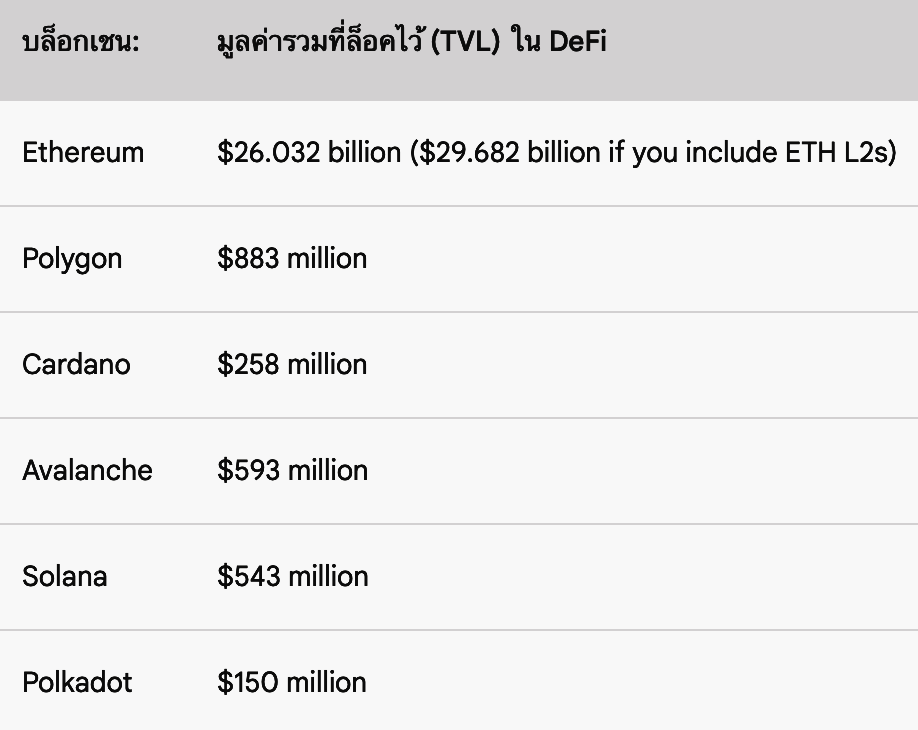 TVL ใน DeFi คือมูลค่าของสินทรัพย์ดิจิทัลทั้งหมดที่ล็อกไว้บนแพลตฟอร์ม DeFi โดยจากข้อมูลในตาราง จะเห็นได้ว่า Ethereum มี TVL ใน DeFi มากที่สุด รองลงมาคือ Polygon, Avalanche และ Solana ในขณะที่ Cardano และ Polkadot ดูเหมือนจะเสียเปรียบคู่แข่งรายอื่น ๆ ในแง่ของ TVL ใน DeFi
