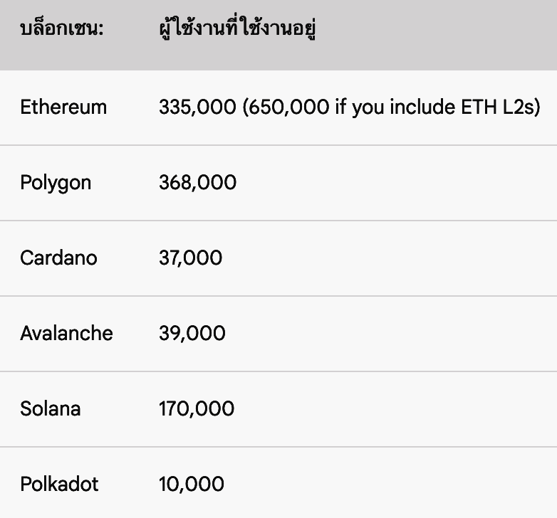จำนวนผู้ใช้งานที่ใช้งานอยู่คือจำนวนผู้ใช้ที่ใช้งานเครือข่ายบล็อกเชนเป็นประจำ โดยจากข้อมูลในตาราง จะเห็นได้ว่า Ethereum มีจำนวนผู้ใช้ที่ใช้งานอยู่มากที่สุด รองลงมาคือ Polygon, Solana, Avalanche และ Cardano