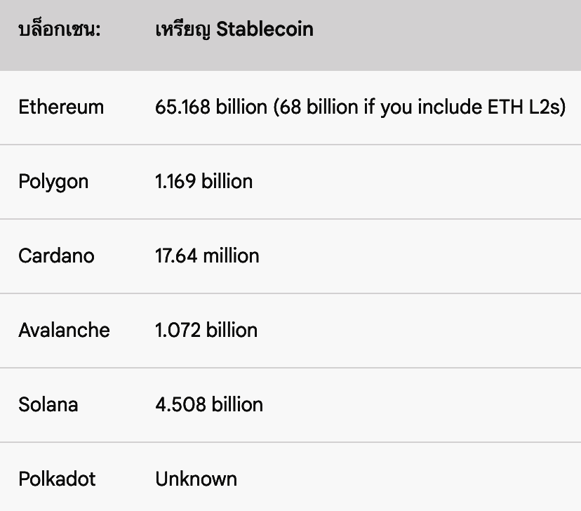 จากข้อมูลปริมาณเหรียญ Stablecoin ที่อยู่บนเครือข่ายบล็อกเชน จะเห็นได้ว่าเครือข่าย Ethereum มีปริมาณเหรียญ Stablecoin มากที่สุด รองลงมาคือ Polygon, Avalanche, Solana และ Cardano
