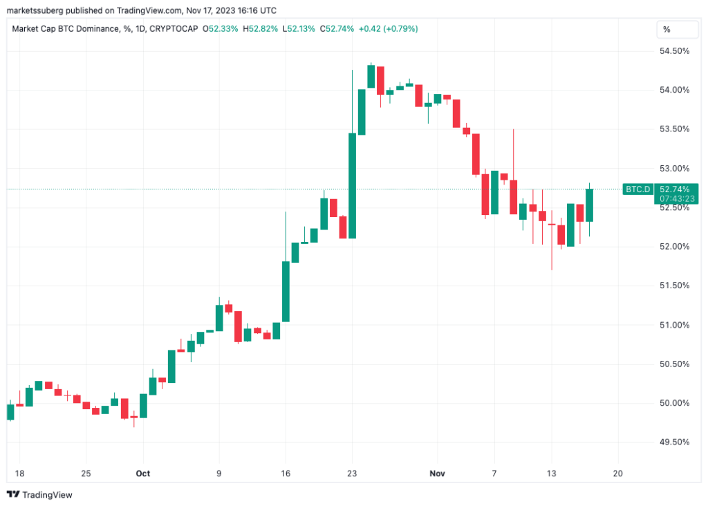 Bitcoin Dominance ได้พุ่งขึ้นแตะระดับสูงสุดในรอบ 1 สัปดาห์ที่ประมาณ 52.82%