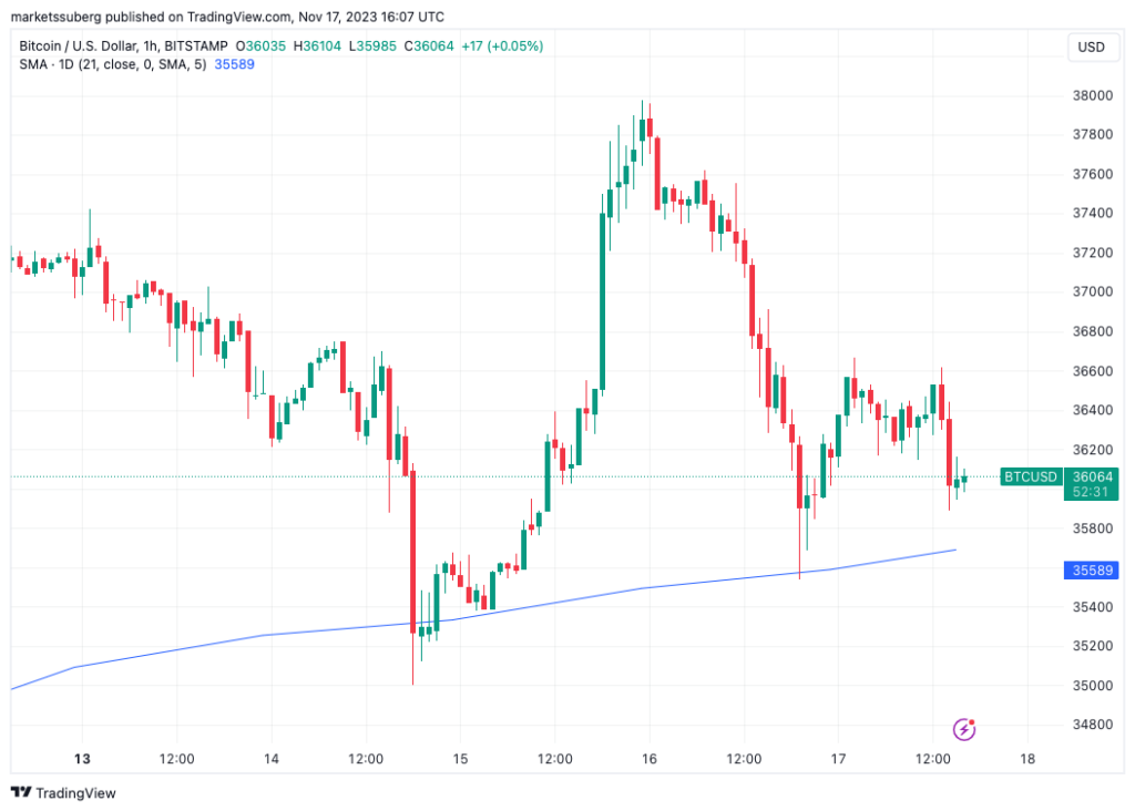 “แนวรับกำลังก่อตัวขึ้นเหนือเส้น  21-days SMA ซึ่งปัจจุบันอยู่ที่ประมาณ 35,700 ดอลลาร์ แล้วคุณหล่ะ คิดว่ามันจะพุ่งไปทางไหน”