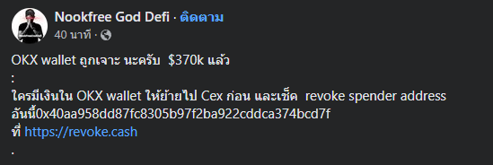 “เราขออภัยที่ต้องแจ้งให้ทราบว่า Smart Contract บน OKX Dex ของเราถูกโจมตี เราได้ดำเนินการทันทีเพื่อปกป้องเงินทุนของผู้ใช้ทั้งหมด และปิดกั้นไม่ให้ Smart Contract นี้ทำงานต่อได้ พร้อมกล่าวว่าจะทำการคืนเงินให้กับผู้ใช้ที่รับผลกระทบในครั้งนี้ด้วย