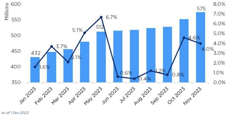 “เมื่อมองไปถึงปี 2024 และสภาวะตลาดที่เป็นขาขึ้น เราคาดว่าจำนวนเจ้าผู้ถือครองสกุลเงินดิจิทัลอาจเพิ่มขึ้นเป็นระหว่าง 850 ถึง 950 ล้าน […] ซึ่งเป็นสะท้อนถึงความสนใจและการยอมรับทั่วโลกที่เพิ่มขึ้นของสกุลเงินดิจิทัล”