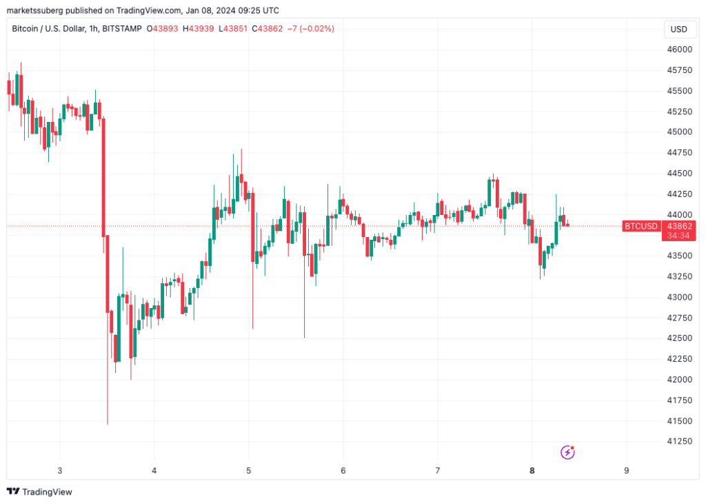 ดูเหมือนว่าในตอนนี้ Bitcoin จะอยู่ในช่วงความสงบก่อนที่พายุจะมาถึง โดยข้อมูลจาก TradingView เผยว่าราคาปิดบนกราฟรายสัปดาห์อยู่ช่วงประมาณ 44,000 ดอลลาร์ ซึ่งมีเพียงแค่การขยับของราคาจากการซื้อขายเพียงแค่ช่วงแคบๆ เท่านั้น