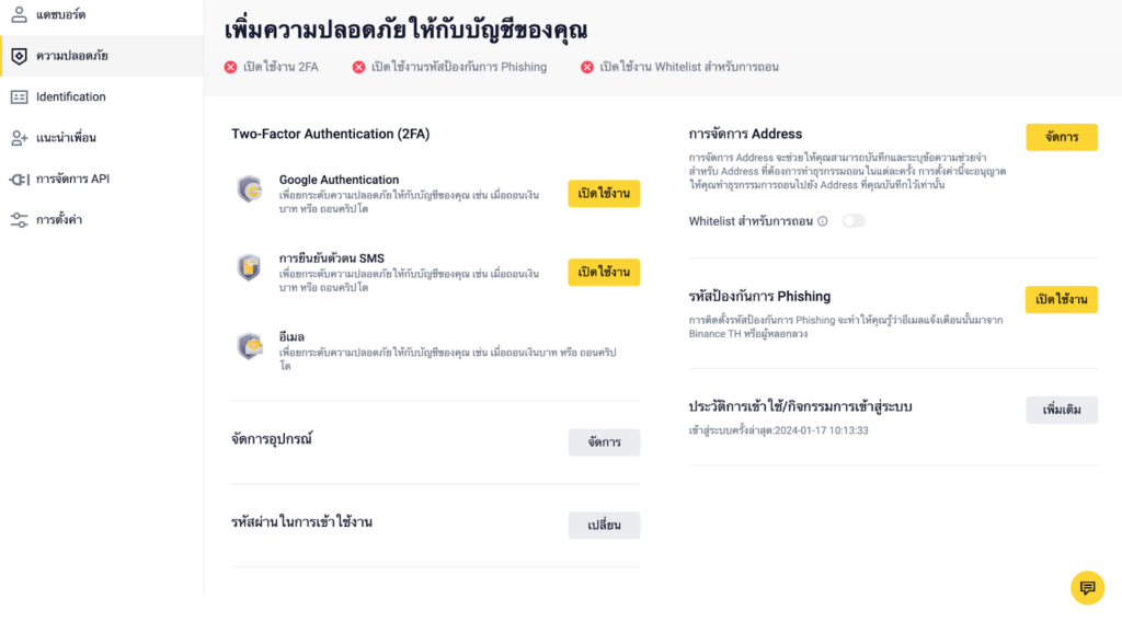 โดยภายในจะประกอบไปด้วย การยืนยันตัวตนต่าง ๆ อาทิเช่น 2FA ผู้ใช้งานที่สนใจจะเข้ามาซื้อขายควรเปิดใช้งานตัวเลือกต่าง ๆ เหล่านี้เพื่อเพิ่มความปลอดภัยให้กับบัญชีของคุณ