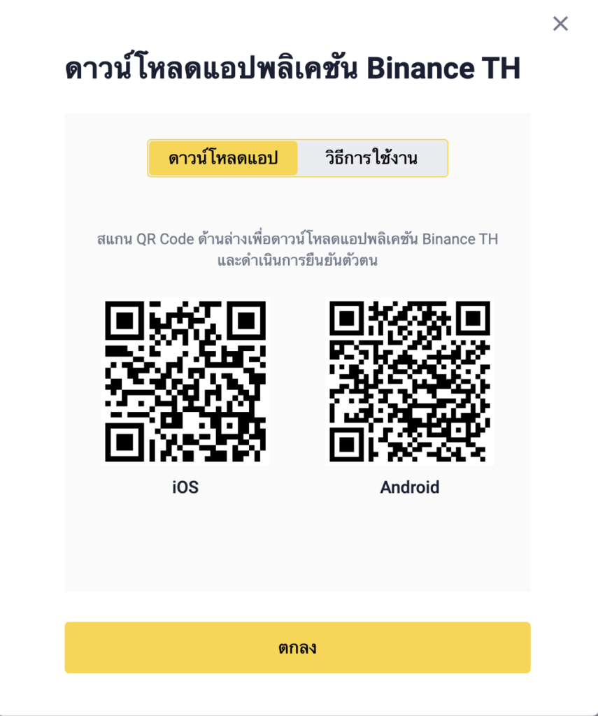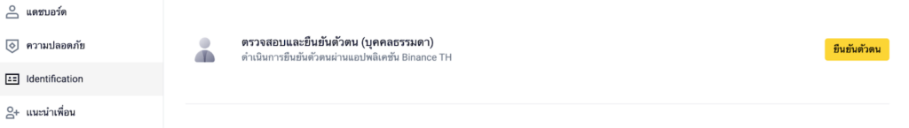 เมื่อเข้าใช้งานแอป Binance.th ให้ผู้ใช้งานกดที่มุมบนซ้าย เพื่อเปิดหน้าต่างเมนู จากนั้นกดที่แถบสีเหลืองด้านขวาเพื่อทำการยืนยันตัวตน