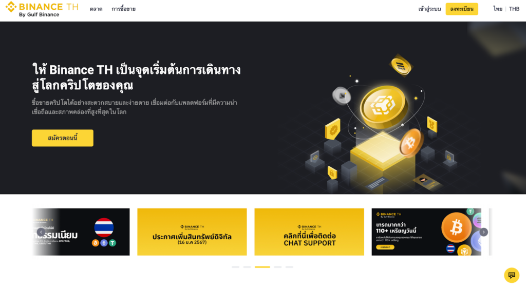 เมื่อเข้ามาที่หน้าแรกของเว็บไซต์ Binance.th เราจะเห็นว่า ดีไซน์ของเว็บไซต์เน้นโทนสีของแบรนด์ Binance อย่างสีเหลือง และดำ โดยในหน้าแรกจะประกอบไปด้วย แบนเนอร์การสมัครสมาชิก ตามมาด้วย ฟีดข่าวการประชาสัมพันธ์ ราคาของเหรียญตัวเด่น ๆ และข้อมูลของแพลตฟอร์ม