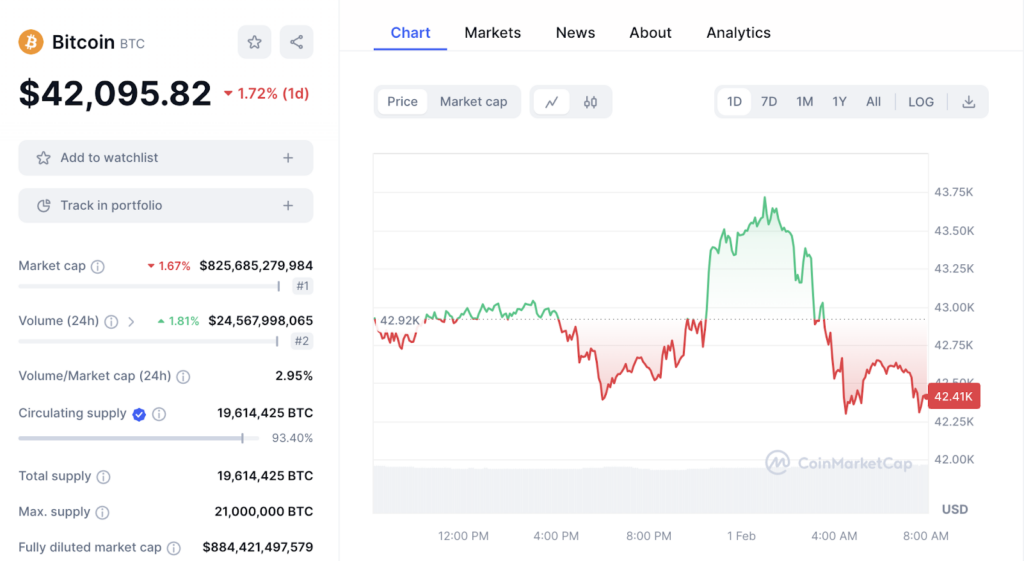 ในขณะที่รายงาน Bitcoin ซื้อขายกันอยู่ที่ราคาประมาณ 42,095 ลดลงมา 1.71% จาก 24 ชั่วโมงที่แล้ว อ้างอิงข้อมูลจาก Coinmarketcap