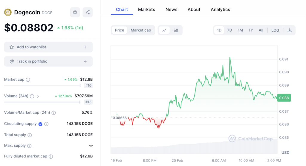 ขณะที่รายงาน Dogecoin มีการซื้อขายกันอยู่ที่ 0.088 ดอลลาร์ เพิ่มขึ้น 1.88% ในช่วงตลอด 24 ชั่วโมงที่ผ่านมาอ้างอิงข้อมูลจาก Coinmarketcap