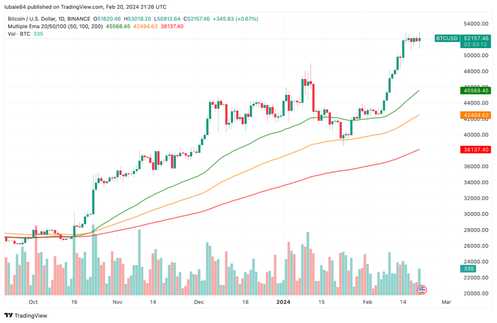 Bitcoin เผชิญกับการปรับฐานอย่างรวดเร็ว เมื่อวันที่ 20 กุมภาพันธ์ โดยราคาร่วงได้ลงไปถึง 4% จากจุดสูงสุดที่ 53,019 ดอลลาร์ ซึ่งไปแตะจุดต่ำสุดอยู่ที่ 50,812 ดอลลาร์ ทำให้กำไรที่ทำได้ในช่วง 7 วันที่ผ่านมาหายไปทั้งหมด