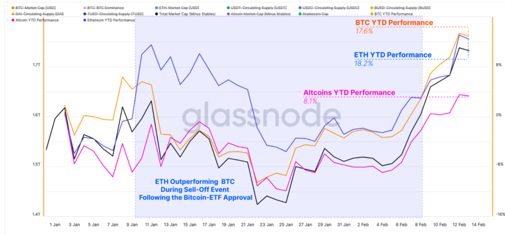 Glassnode ระบุว่า แม้ Ethereum (ETH) จะมีผลตอบแทนที่ดีกว่า Bitcoin (BTC) หลังจากการอนุมัติกองทุน Spot Bitcoin ETF ในเดือนมกราคม แต่ผลตอบแทนของ ETH กลับลดลงต่ำกว่า BTC เมื่อวันที่ 8 กุมภาพันธ์