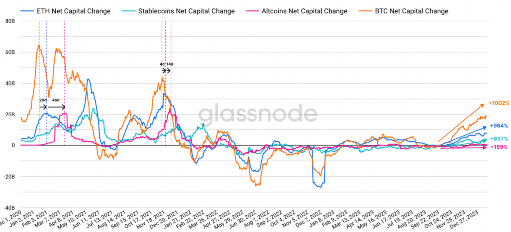 Glassnode ชี้ให้เห็นว่า Bitcoin ยังคงแสดงถึงความโดดเด่น โดยมี “เงินทุนไหลเข้าประมาณ 2 หมื่นล้านดอลลาร์ต่อเดือน” ในขณะที่กราฟด้านล่างเน้นย้ำ การครองตลาดของ Bitcoin เพิ่มขึ้นอย่างต่อเนื่อง โดยมีมูลค่าตลาดสัมพัทธ์เพิ่มขึ้น 1000% ตั้งแต่เดือนตุลาคม 2023