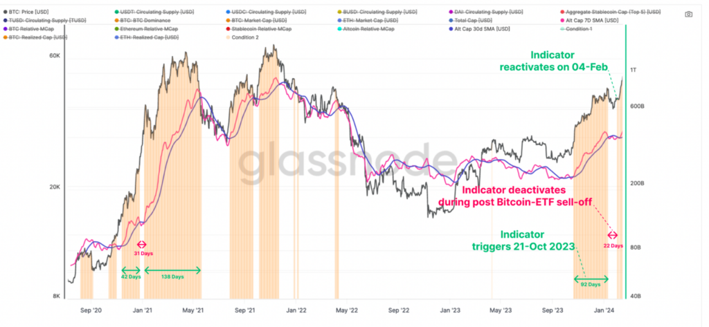 ตัวชี้วัดของ Glassnode สำหรับ altcoin season แสดงแนวโน้มที่ดีตั้งแต่เดือนตุลาคมปีที่แล้ว และเพิ่งกลับมาเปลี่ยนเป็นบวก เมื่อวันที่ 4 กุมภาพันธ์ หลังจากหยุดชะงักช่วงเหตุการณ์การขายข่าว “sell-the-news” ที่เกิดจากการอนุมัติกองทุน Bitcoin ETFs ในเดือนมกราคม