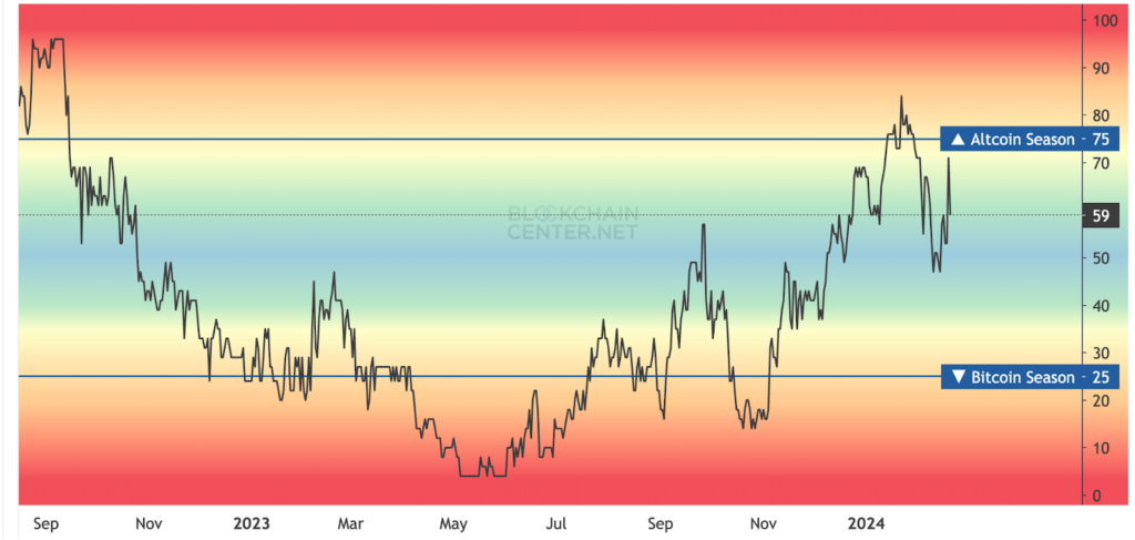 ข้อมูลจาก Blockchain Center ชี้ให้เห็นว่า ในช่วง 90 วันที่ผ่านมา มีเพียง 59% ของ altcoin 50 อันดับแรกที่ทำผลงานได้ดีกว่า Bitcoin แม้ว่าดัชนีนี้อาจจะเพิ่มขึ้นในช่วงไม่กี่วัน แต่มันยังไม่เพียงพอที่จะประกาศว่าเป็น altseason เพราะสำหรับการประกาศ altseason ตัวเลขนี้จะต้องขยับขึ้นไปอยู่เหนือมากกว่า 75%