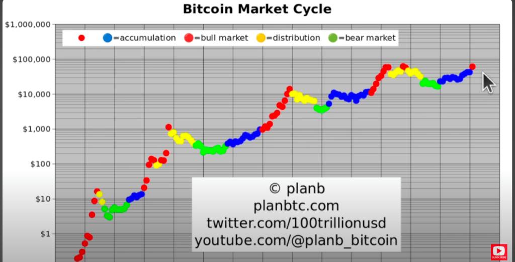 ในคลิปตอนใหม่ล่าสุด PlanB ได้มีการแชร์กราฟ Bitcoin กับสมาชิกผู้ติดตามในช่อง YouTube โดยเขาได้แสดงให้เห็นถึง วัฏจักรตลาด Bitcoin ทั้งหมด 4 เฟสตั้งแต่ เฟสการสะสม, เฟสตลาดกระทิง, เฟสการกระจายตัว และ เฟสตลาดหมี