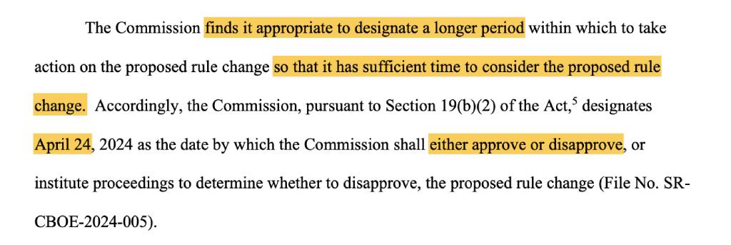 เมื่อวันที่ 6 มีนาคมที่ผ่านมา ตามเอกสารคำร้องที่ตลาดหลักทรัพย์ Cboe และ ตลาดหลักทรัพย์ระหว่างประเทศไมอามี่ (Miami International Securities Exchange) ได้ยื่นร้องต่อ ก.ล.ต เกี่ยวกับการเสนอเปิดให้มีการซื้อขาย Spot Bitcoin ETF Options ซึ่งขณะนี้ ก.ล.ต ได้ตัดสินใจเลื่อนผลการพิจารณาคำร้องดังกล่าวเป็นที่เรียบร้อยแล้ว