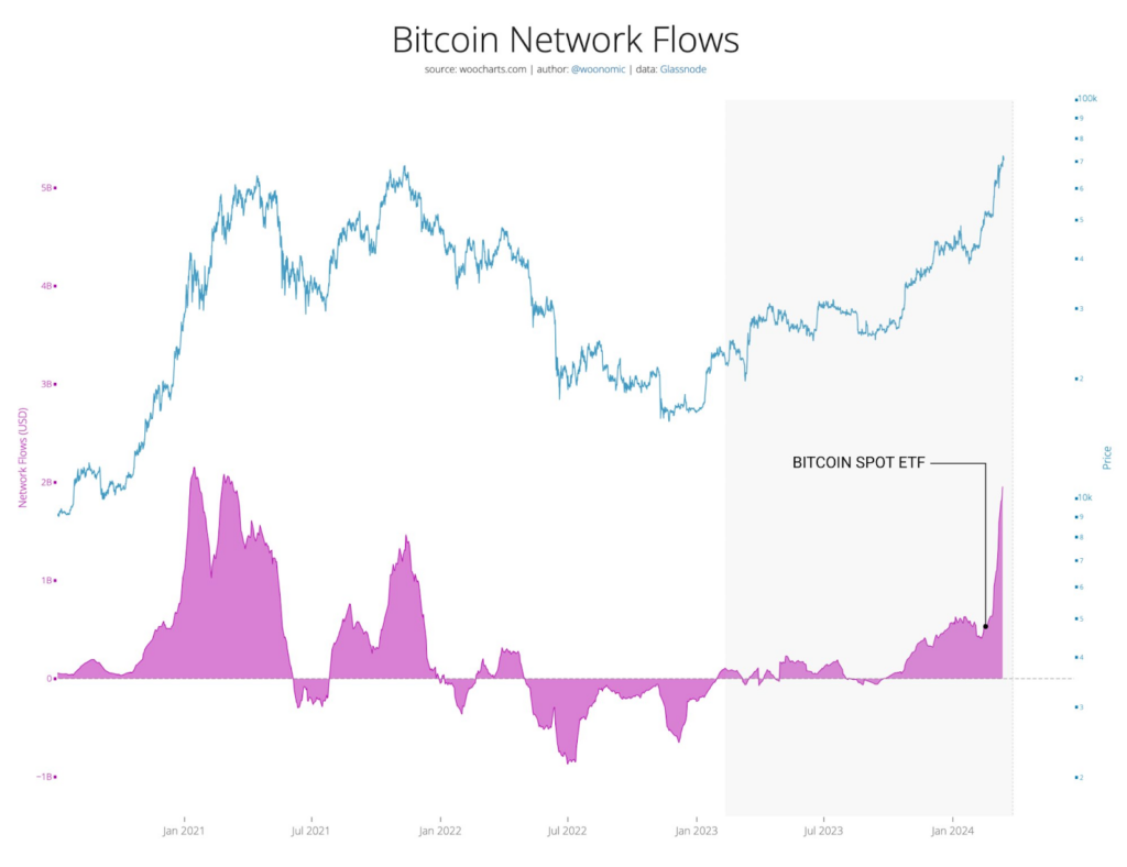 Woo บอกกับผู้ติดตาม 1 ล้านคนของเขาบนแพลตฟอร์มโซเชียลมีเดีย X ว่าเงินทุนไหลเข้ารายวันของ Bitcoin เพิ่งแตะระดับ 2 พันล้านดอลลาร์ต่อวัน ซึ่งเทียบเท่ากับระดับของตลาดกระทิงเต็มรูปแบบครั้งล่าสุด
